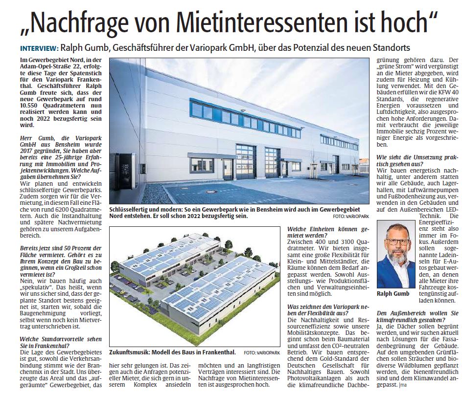 Im Gewerbegebiet Nord, in der Adam-Opel-Straße 22, erfolgte diese Tage der Spatenstich für den Variopark Frankenthal. Geschäftsführer Ralph Gumb freute sich, dass der neue Gewerbepark auf rund 10.550 Quadratmetern nun realisiert werden kann und noch 2022 bezugsfertig sein wird.