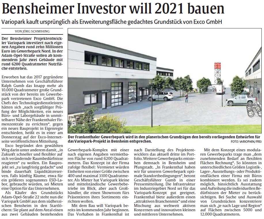 Der Projektentwickler VarioPark realisiert auf brachliegenden Grundstücken multifunktional und flexibel nutzbare Gewerbeeinheiten, die insbesondere Unternehmensgründer sowie kleine und mittlere Unternehmen ansprechen sollen. Der Prototyp entsteht ab Anfang 2020 in Bensheim.