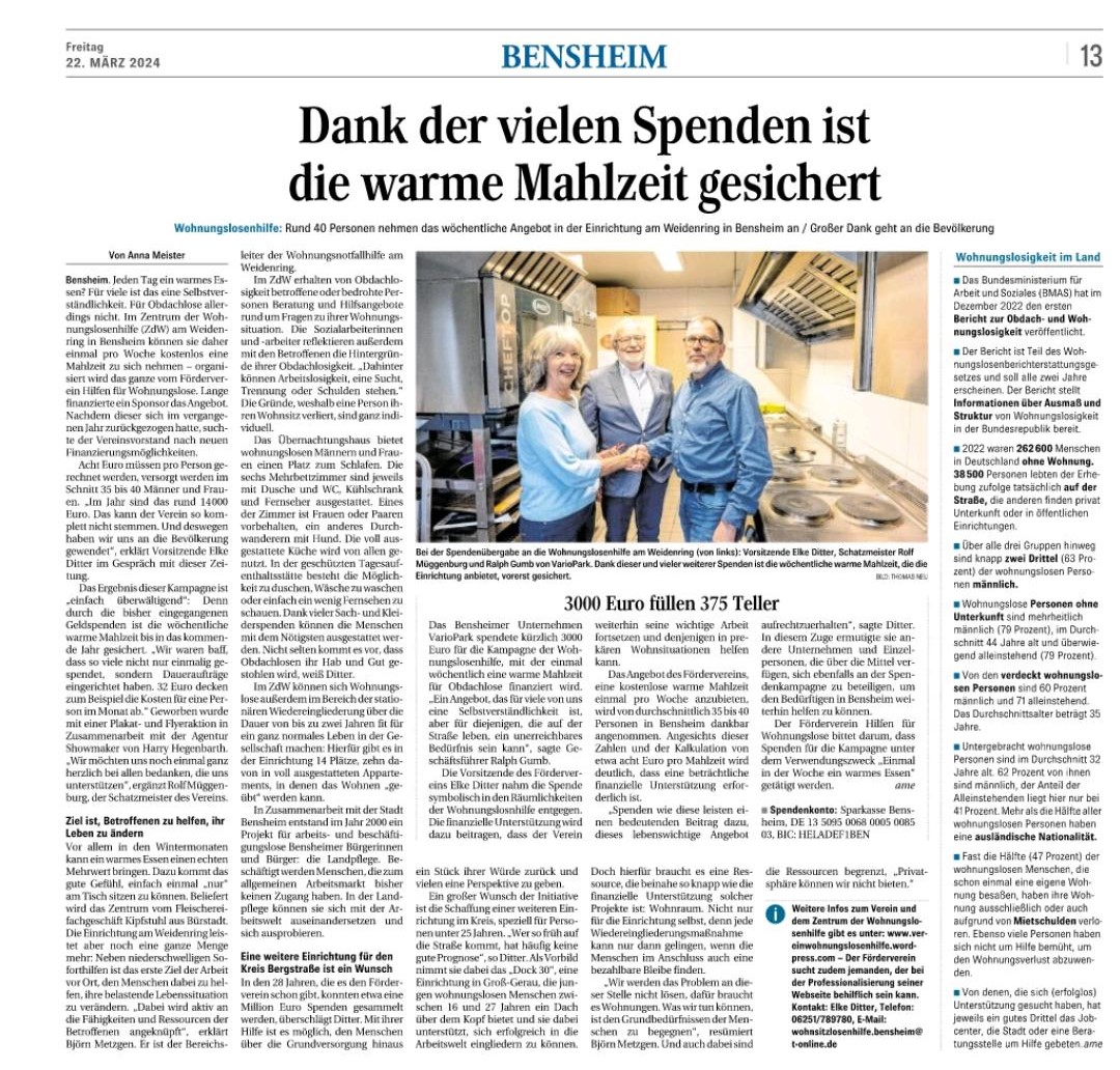 (Anna Meister) Das Bensheimer Unternehmen VarioPark spendete kürzlich 3000 Euro für die Wohnunglosenhilfe, mit der einmal wöchentlich eine warme Mahlzeit für Obdachlose finanziert wird. "Ein Angebot, das für viele eine Selbstverständlichkeit ist, aber..."