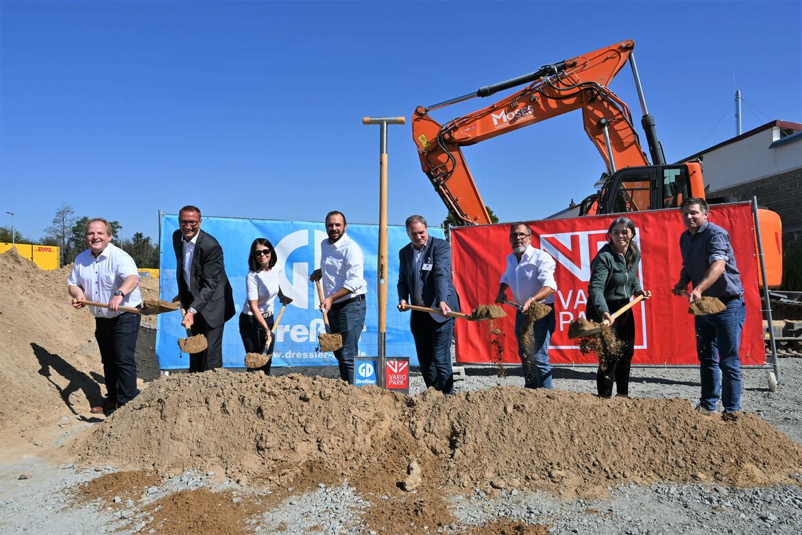 Bei dem Außentermin wird unter anderem verdeutlicht, dass VarioPark auch in punkto Nachhaltigkeit neue Wege einschlägt. In der rund 6,90 Meter (UKB) hohen Gebäudehalle der KfW-Energieeffizienzklasse 40 werden moderne Klimasysteme und energieeffiziente Heizungstechnologien integriert. Eine Photovoltaikanlage auf den begrünten Dachflächen liefert den Strom für die Wärme beziehungsweise Kühlung von Büros und Hallen. Das ermöglicht nicht nur maximalen Komfort, sondern auch eine weitgehend autarke Versorgung der Gewerbeflächen, einen CO2-neutralen Betrieb über die Gebäudelaufzeit und niedrige Nebenkosten für Mieter. Hinzu kommen Außenanlagen mit viel Biodiversität und E-Ladesäulen an allen Modulen für alternative Mobilitätskonzepte. „Wir freuen uns sehr, dass wir bei einem so nachhaltigen Konzept mitwirken und mitgestalten können“, so Manuel Voß, Niederlassungsleiter der Dreßler Bau GmbH. „Mit VarioPark haben wir einen super Partner gefunden, der genau in unsere Richtung geht.“